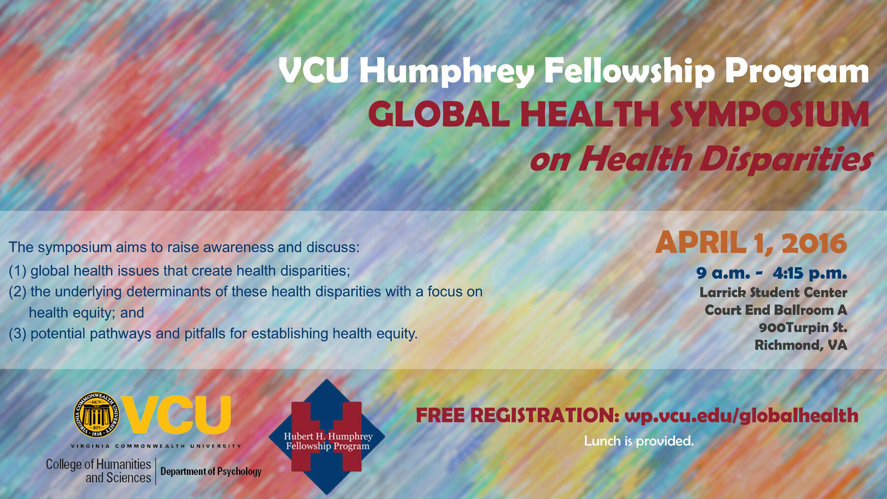 The VCU Global Health Symposium on Health Disparities will be held Friday, April 1, from 9 a.m. to 4:15 p.m. in the Larrick Student Center, Court End Ballroom A, 900 Turpin St.