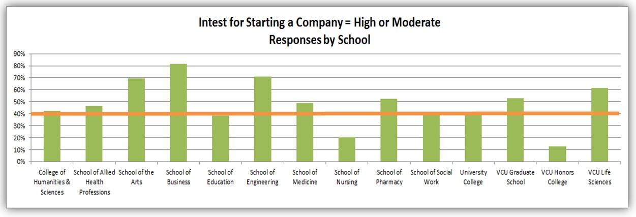 A recent survey of VCU students showed that 51 percent are interested in starting their own company at some point, and interest in entrepreneurship is spread across all schools at VCU. The survey also indicated that 15 percent of students either already had started a company or were actively trying to start one.