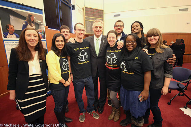 Feature photo at top: VCU AmeriCorps Program Director Jenny Callear (left) and program participants were present when Gov. Terry McAuliffe announced Virginia was becoming an Employer of National Service. Photo by Michaele L. White, Virginia governor’s office.
