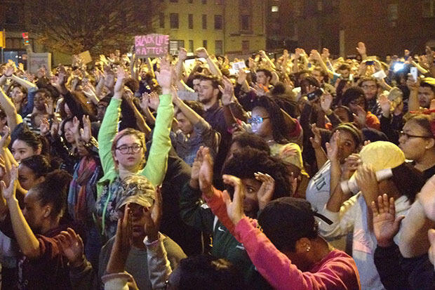 Feature image at top: A scene from a student protest related to the shooting death of Michael Brown in Ferguson, Missouri. Photo from Maya Earls.
