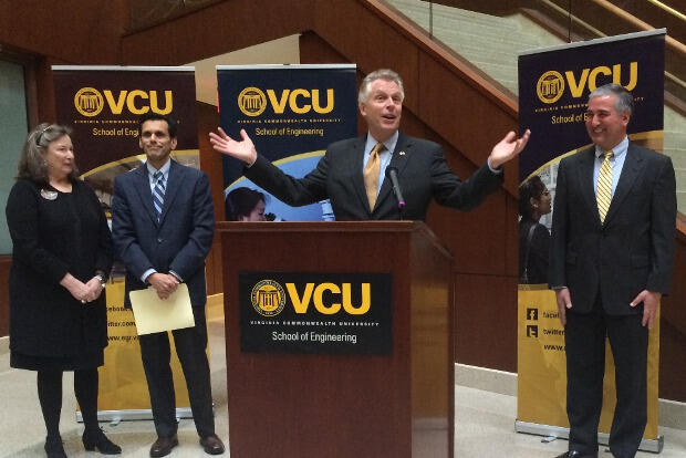 Feature image at top: Gov. Terry McAuliffe speaks during the ceremony. Joining him were (from left) Barbara Boyan, Ph.D., dean of the VCU School of Engineering; VCU President Michael Rao, Ph.D.; and Joseph Moody, CCAM president and executive director.