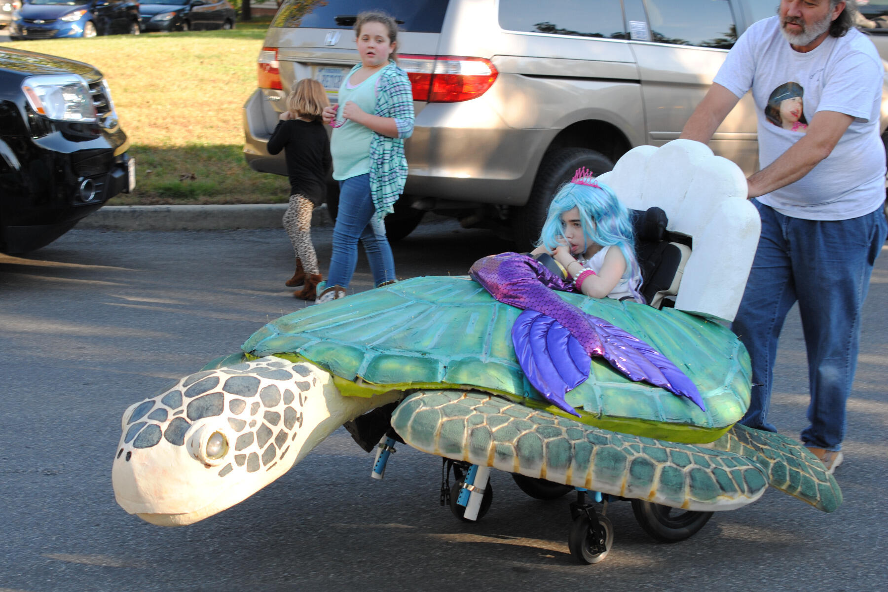 Visible from the waist up, Chloey accessorized her shimmering purple mermaid tail with a tiara and a blue and purple wig, as she took her first ride in her completed “magic” costume in front of the students, family and friends.