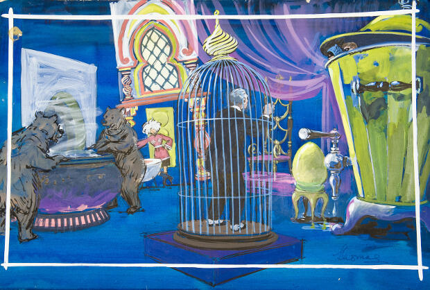 - “Olga’s Lair,” a pre-production set design for “The Ogg and I,” season 3, episode 8 of the “Batman” TV series, which aired on Nov. 2, 1967. The painting shows the lavishly decorated lair of Egghead’s accomplice, Olga, Queen of the Bessarovian Cossacks, with Commissioner Gordon trapped in a cage set on a square platform. Batman and Robin can be seen peeking out of the top of a giant Samovar of Genghis Khan.