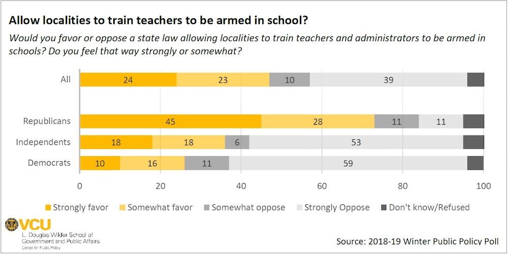 Virginians are almost evenly split between favoring and opposing a state law that would allow localities to train teachers and administrators to be armed in schools, according to a new poll by the L. Douglas Wilder School of Government and Public Affairs at Virginia Commonwealth University.