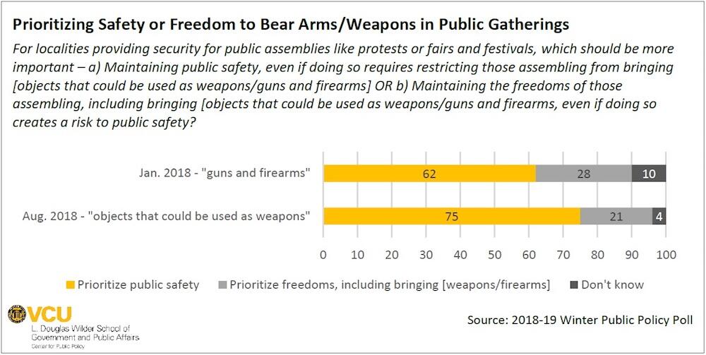 The question mirrored a similar question in the Wilder School’s 2018 Summer Public Policy Poll that asked about “objects that could be used as weapons” rather than firearms. Changing the wording in the winter poll decreased the portion of respondents who said prioritizing public safety should be the most important concern from 75 percent when considering “weapons” to 62 percent when considering “guns and firearms.”