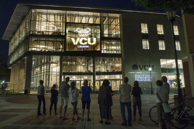 In late August, something new was likely to catch your eye if you were walking down Shafer Court toward the James Branch Cabell Library, and it wasn’t the crush of back-to-school students passing in and out of the building’s revolving doors, but rather something right above it. The library’s new media façade — also known as the “big screen” or vitrine — lit up for the first time.
